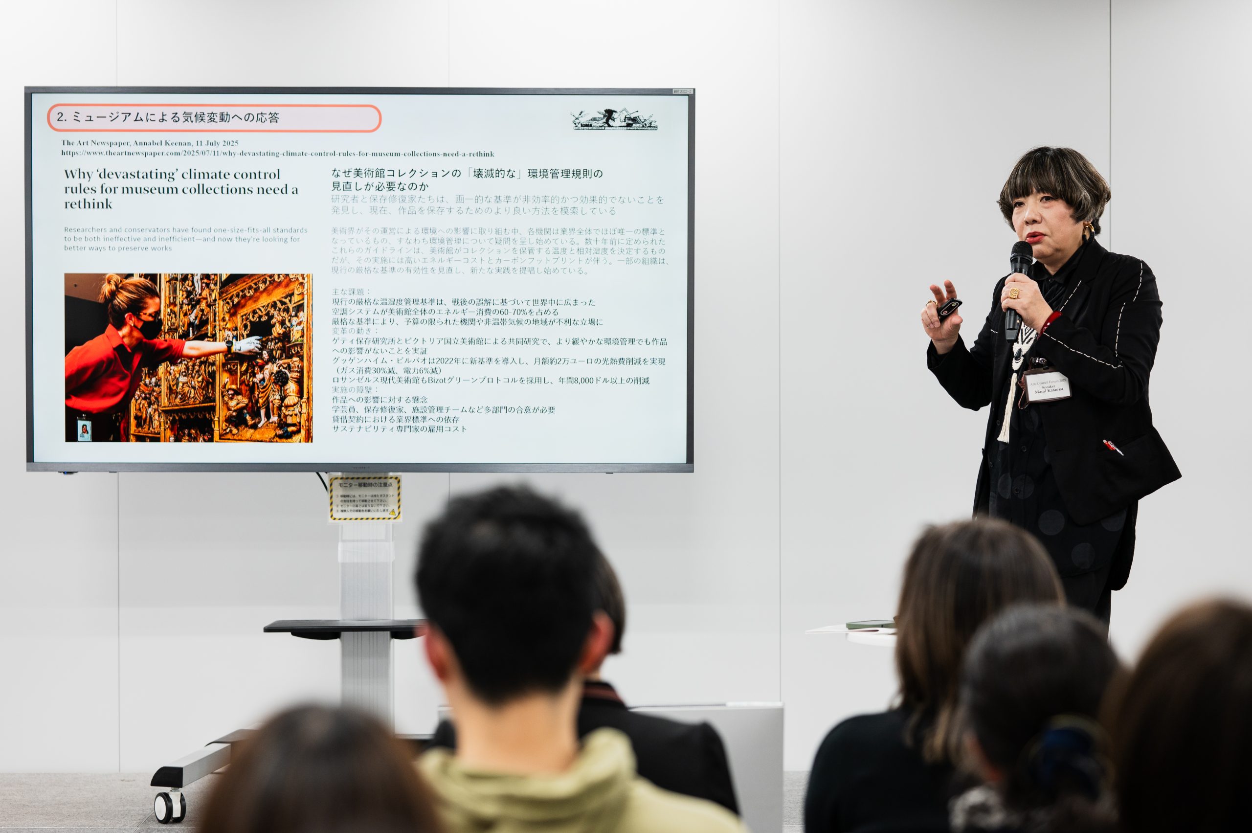 片岡さんによると、世界の主要美術館の館長が参加する国際的な非営利の会議体「BIZOT(ビゾ)・グループ」では、近年特に注力しているテーマのひとつに、美術館活動と環境負荷の関係を挙げていると紹介されました。2014年には「The Bizot Green Protocol(ビゾ・グリーン・プロトコル)」と呼ばれるガイドラインを策定。美術館活動における環境負荷削減の方向性を提示しました。2023年にはその内容が更新され、国際的な美術館界での共通指針として再確認されているそうです。