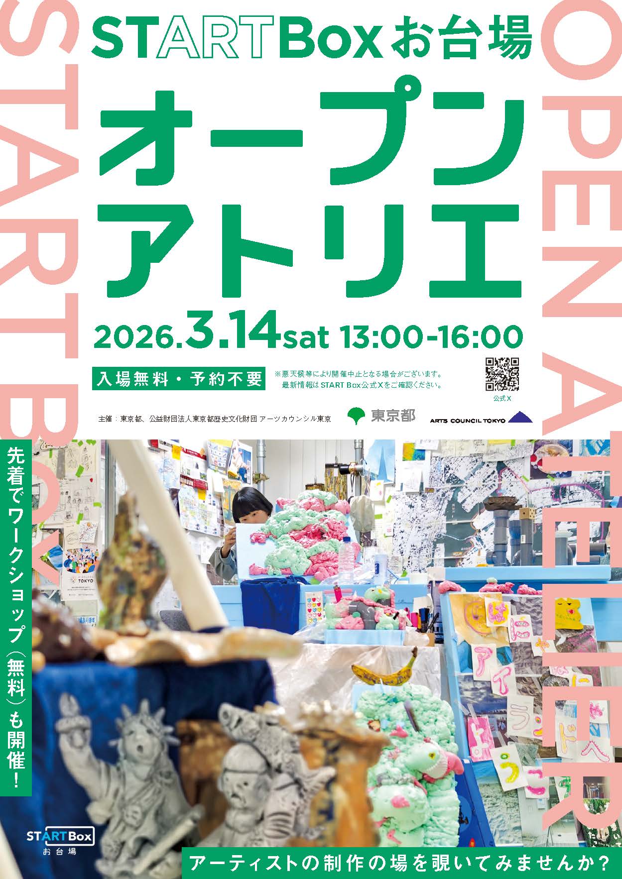 若手アーティストに創作の場を提供し、継続的な活動を支援する事業である「START Box」。都営住宅等の空き店舗をアトリエにリノベーションする形で、ビジュアルアーツ分野の若手アーティストに対して、利用しやすい料金で貸し出す事業として2023年に始まりました。これまで、笹塚・幡ヶ谷の水道道路沿いにある都営住宅の空き店舗を活用した「START Box ササハタハツ」とお台場の都民住宅敷地内の駐車場の一角を活用した「START Box お台場」の2拠点で、約3年間で延べ67名のアーティストが利用してきました。施設を利用するアーティストに対しては、創作場所の支援だけでなく、地域やアーティスト同士の交流の機会や、作品発表の場なども提供しており、特に半期に一度開かれる「START Box EXHIBITION」は作品発表のほか、アーティストトークや対話型鑑賞といった関連プログラムを交えながら、アーティスト同士あるいはアーティストと来場者、アーティストと社会との出会いの場として好評を博しています。