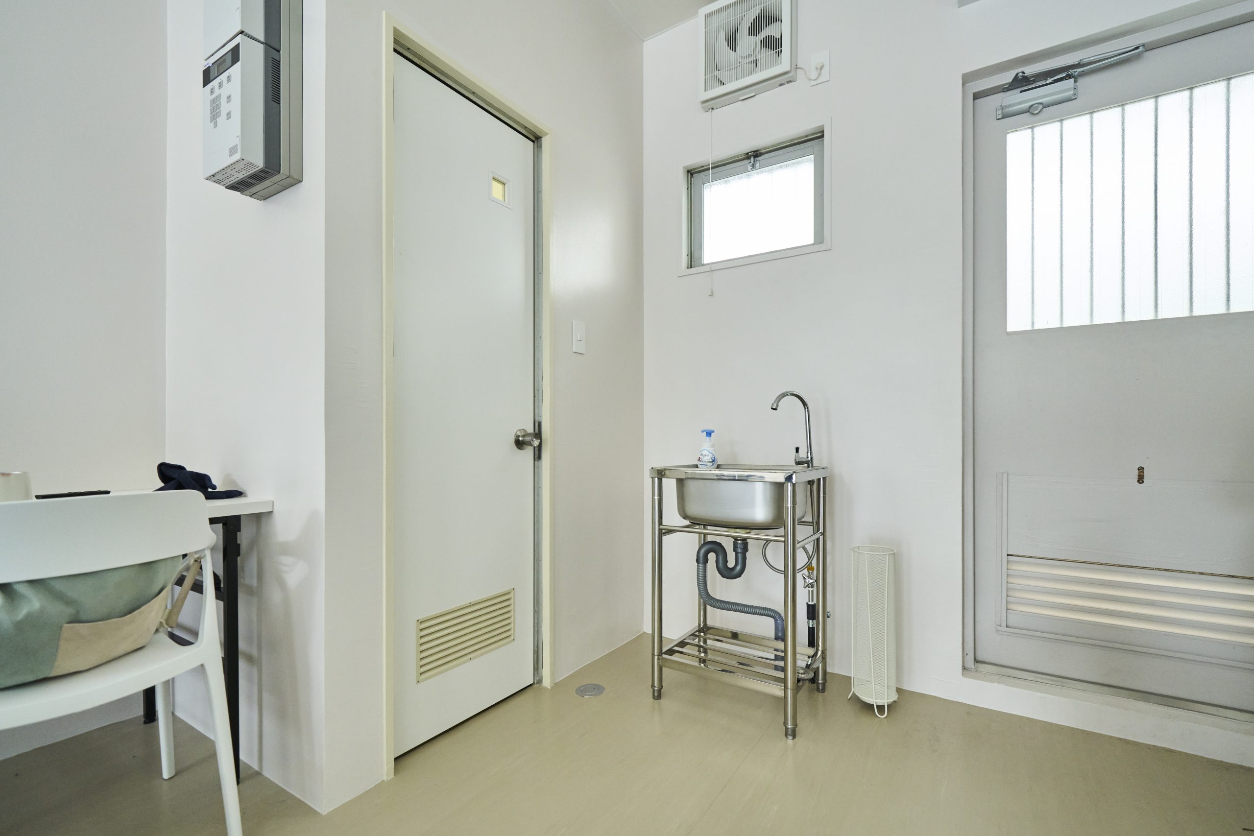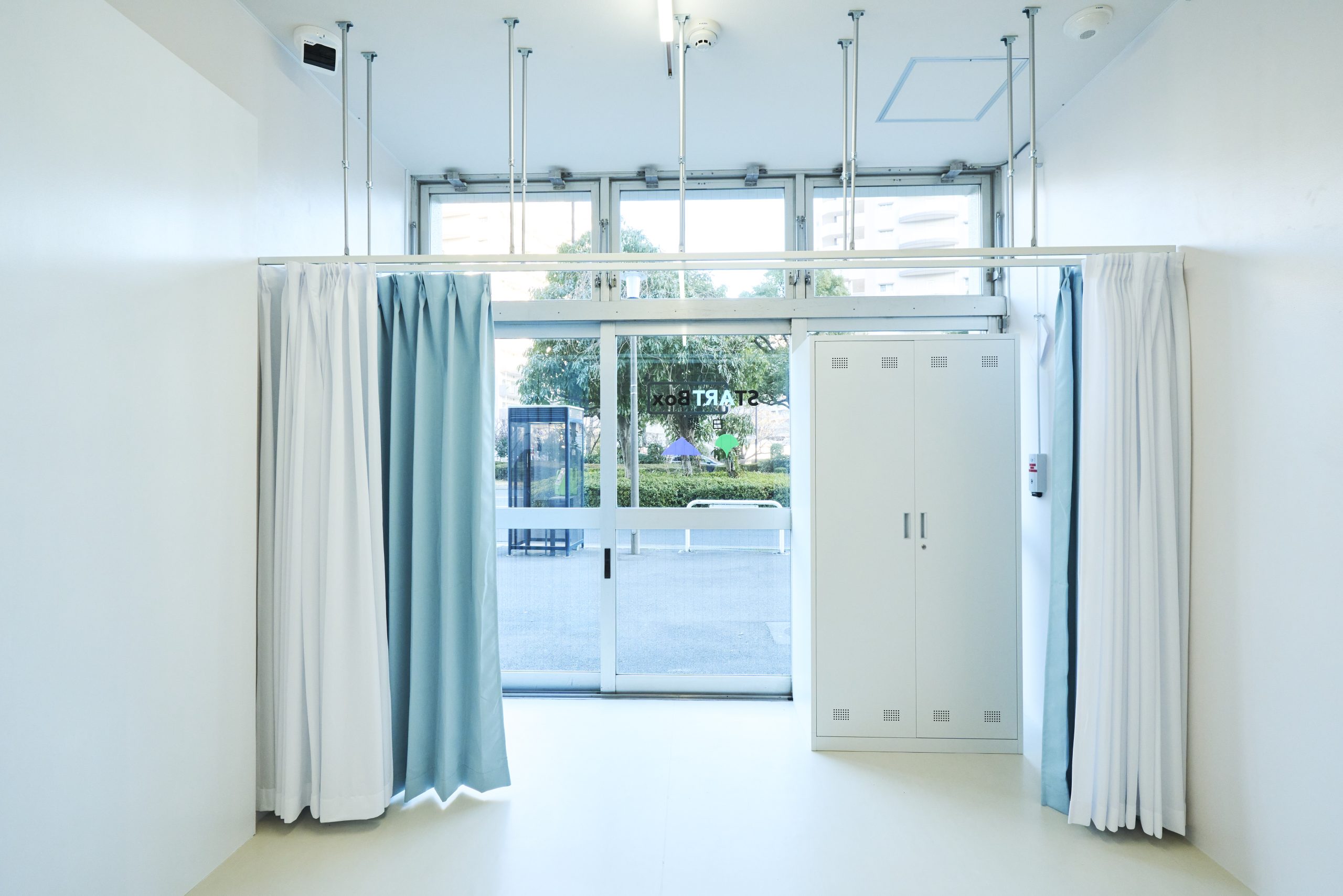 「アトリエ」内には個室ごとにトイレと水場が完備されており、冷暖房設備やWi-Fi、冷蔵庫も利用できます。前述の通り、通りに面する開口部は全面ガラス張りではありますが、目隠しになるカーテンが常設されているので、開放したい時は開けて、集中したい時は閉めるといった、状況に合わせた使い方ができるようになっているのも嬉しいポイントです。