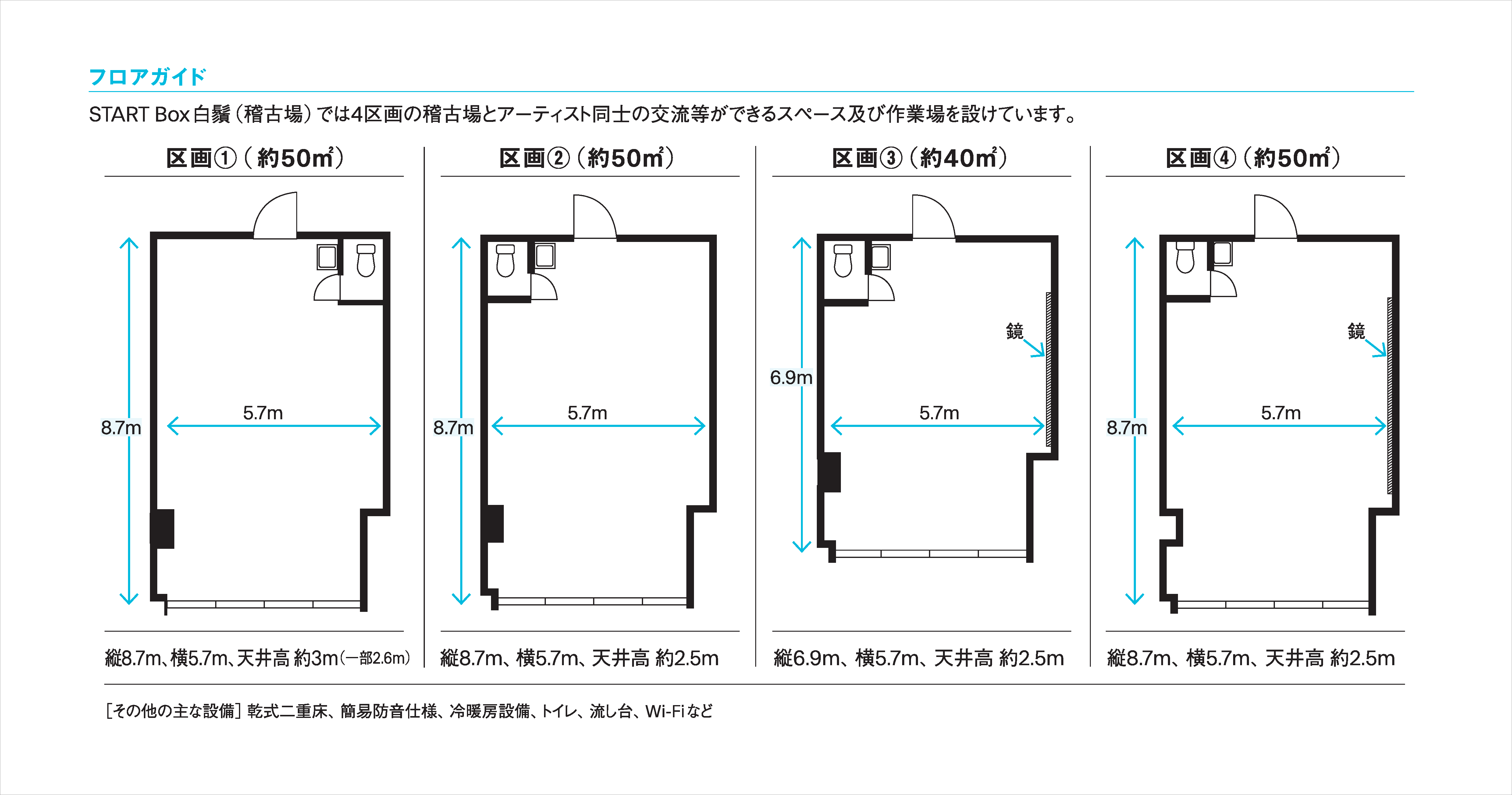 「稽古場」は「START Box」初めての試みということで、外部のスタジオ見学や専門家へのヒアリング等を踏まえて空間作りを検討。全4区画で、約50㎡が3つ、約40㎡が1つとなっており、稽古場利用者は、付帯施設として「作業場」も自由に使うことができます。