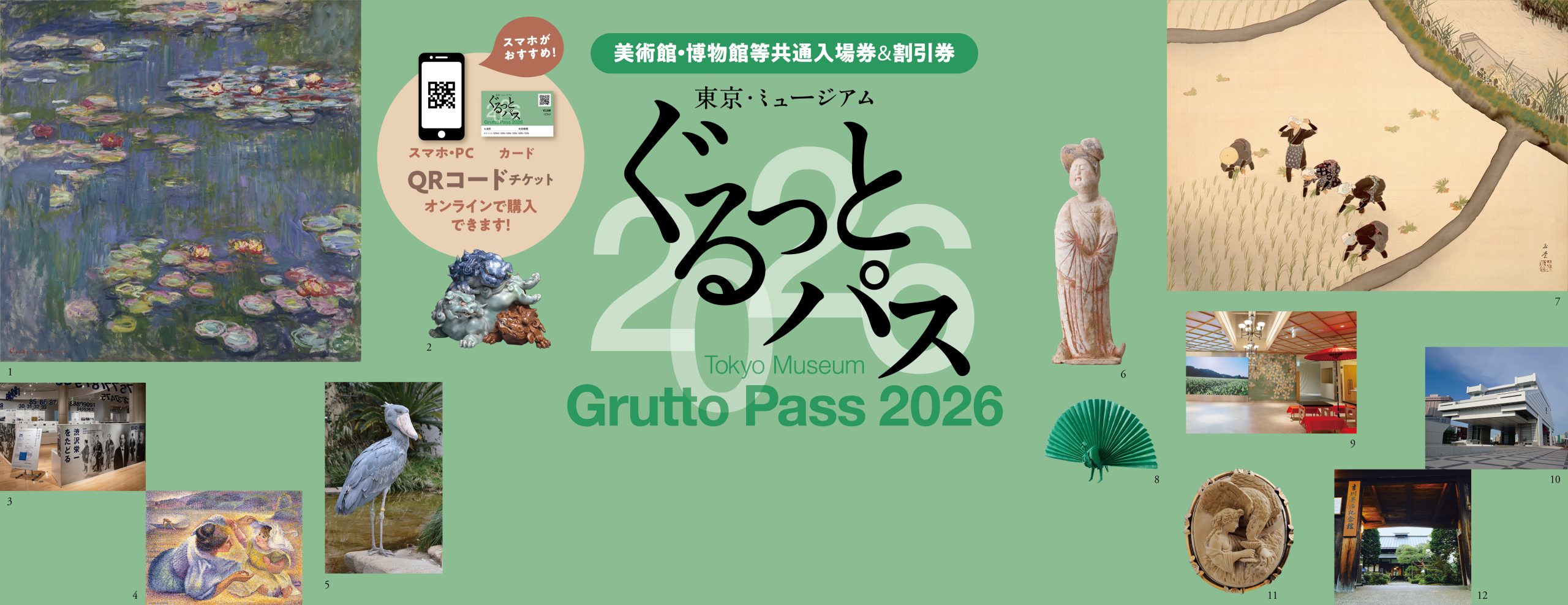 1.国立西洋美術館 クロード・モネ 《睡蓮》 1916年 国立西洋美術館蔵 松方コレクション 2.戸栗美術館 《青磁銹釉染付 獅子置物》 三川内 19世紀 戸栗美術館蔵 3.渋沢史料館 常設展示「渋沢栄一をたどる」 渋沢史料館 4.松岡美術館 アンリ=エドモン・クロッス 《遊ぶ母と子》 松岡美術館蔵 5.恩賜上野動物園 ハシビロコウ (公財)東京動物園協会 6.石洞美術館 《加彩婦女俑》 8世紀 石洞美術館蔵 7.山種美術館 川合玉堂 《早乙女》 1945年 山種美術館蔵 8.紙の博物館 吉澤章 創作折り紙《クジャク》 紙の博物館蔵 9.お茶の文化創造博物館 エントランス お茶の文化創造博物館 10.東京都江戸東京博物館 外観 東京都江戸東京博物館 11.アクセサリーミュージアム ラーバ(溶岩)のカメオブローチ《へーべーとゼウスの鷲》 19世紀中期~後期 アクセサリーミュージアム蔵 12. 青梅市吉川英治記念館 旧吉川英治邸(草思堂)長屋門 19世紀 青梅市吉川英治記念館